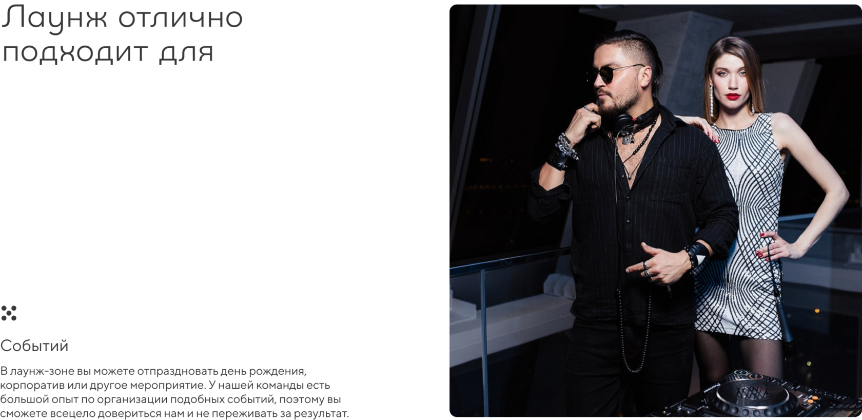 Располагайтесь по удобнее, ведь эта зона предназначена только для членов клуба и их гостей. Здесь удобно проводить встречи с деловыми партнерами, наслаждаясь прекрасным видом на Москву и ее достопримечательности.