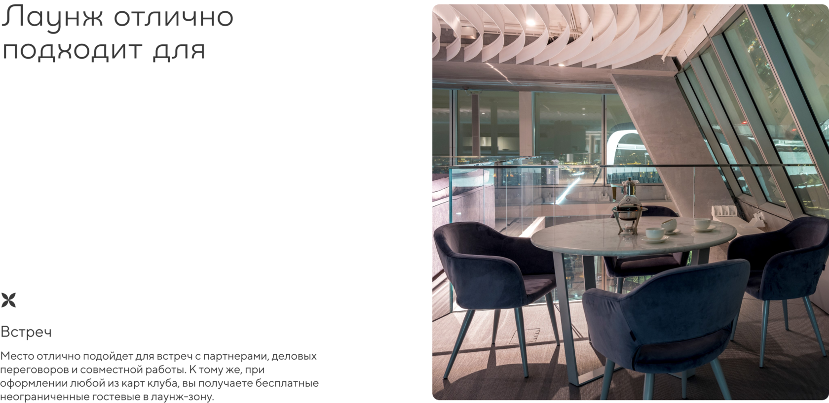 и их гостей. Здесь удобно проводить встречи с деловыми партнерами, наслаждаясь прекрасным видом на Москву и ее достопримечательности.